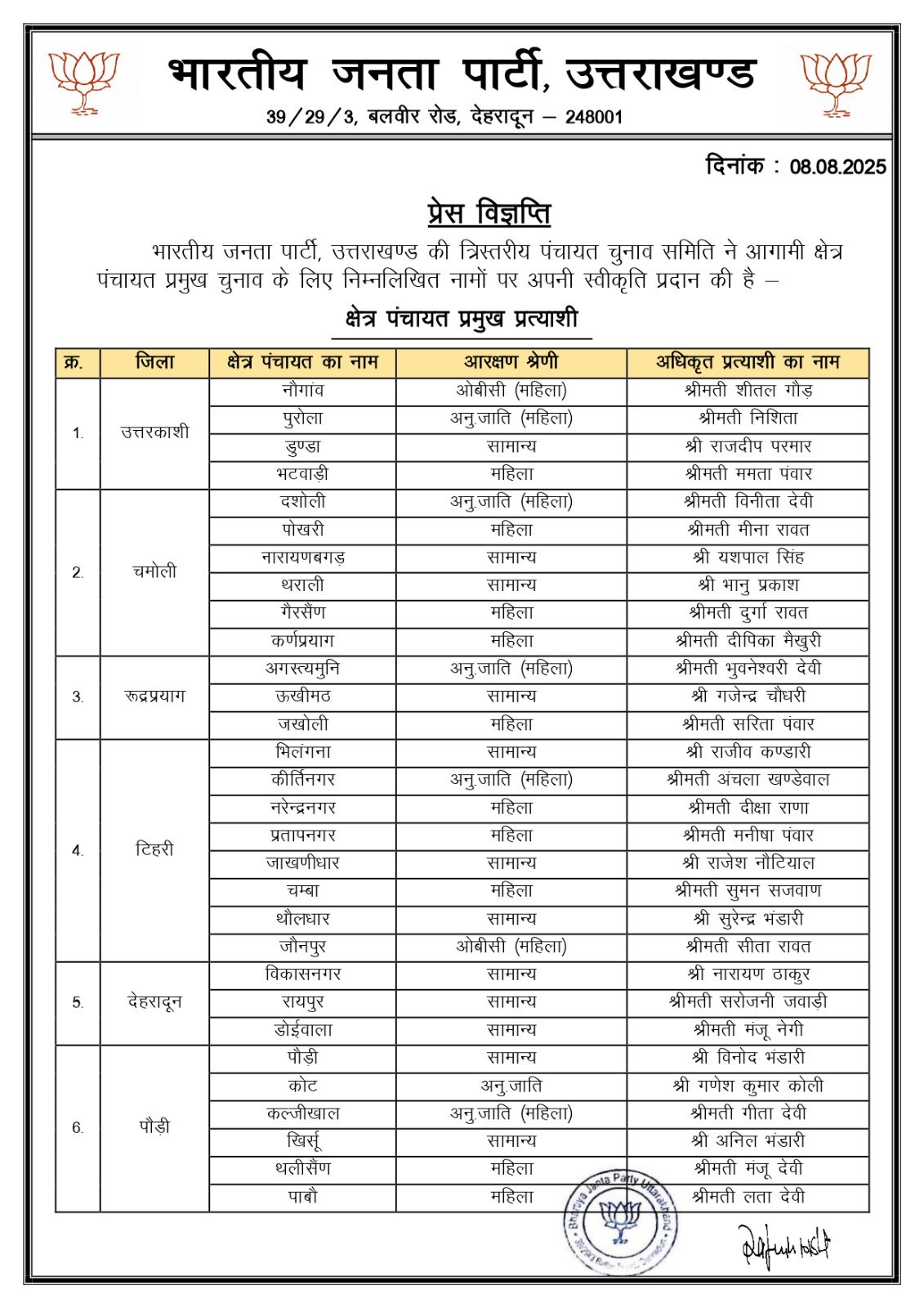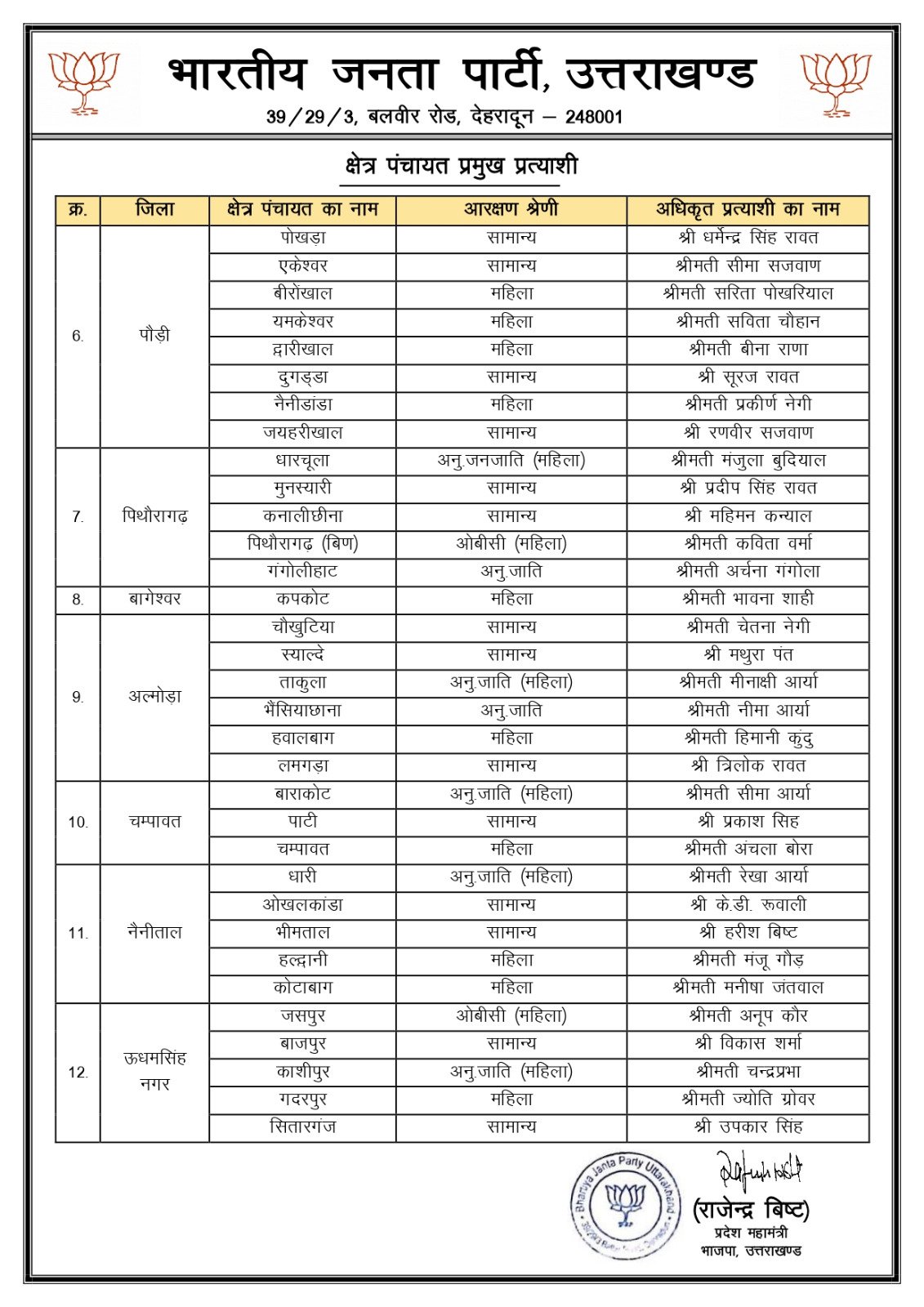 भाजपा ने त्रिस्तरीय पंचायत चुनाव में ब्लॉक प्रमुख पदों के लिए अपने प्रत्याशियों की सूची जारी कर दी है। पार्टी ने हरिद्वार को छोड़कर राज्य के सभी 12 जनपदों के ब्लॉकों में उम्मीदवार उतारे हैं।