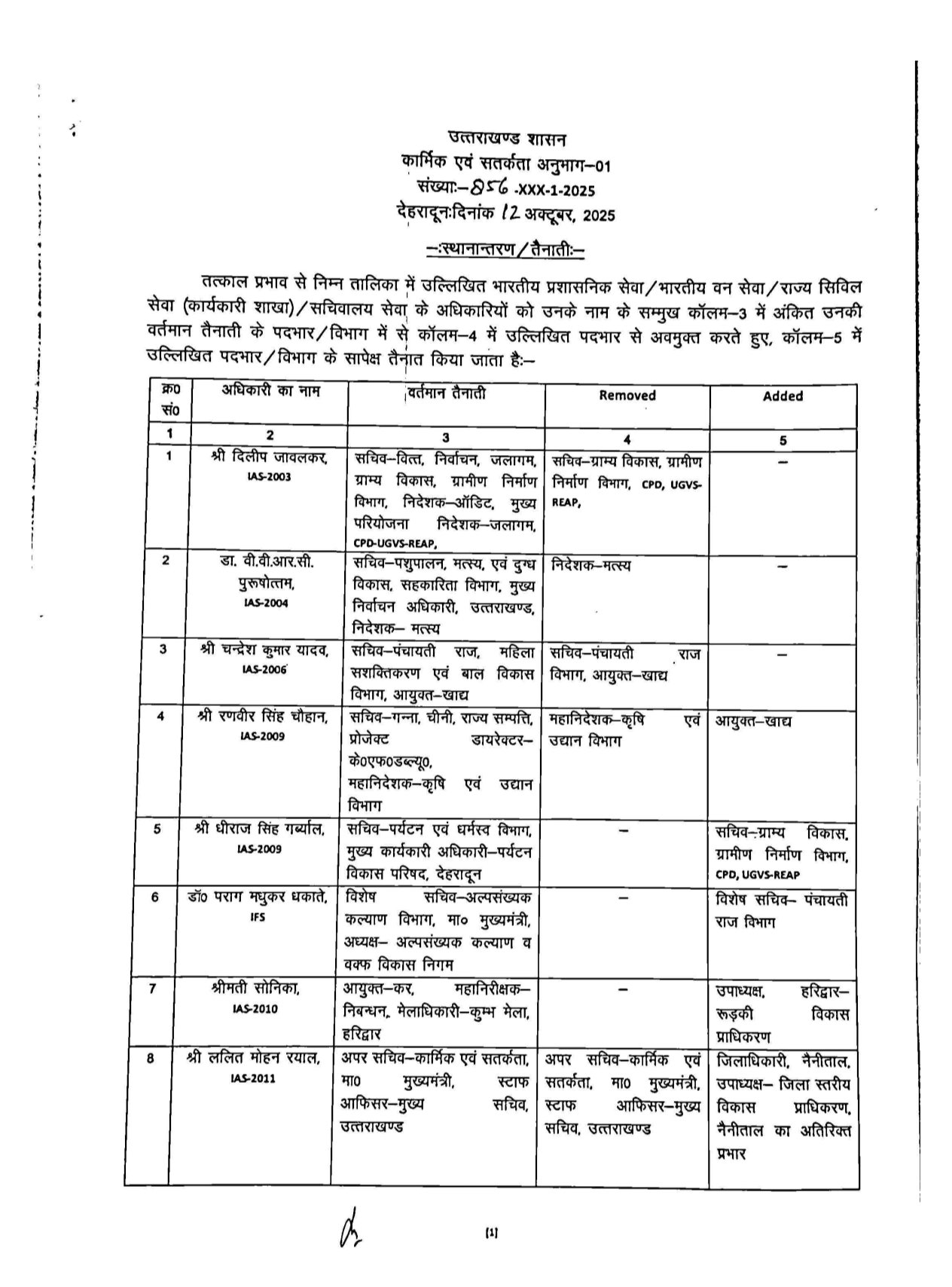 - डॉ० पराग मधुकर धकाते (IFS) को पंचायती राज विभाग के विशेष सचिव पद से हटाकर अब उन्हें मुख्यमंत्री के विशेष सचिव, अल्पसंख्यक कल्याण विभाग के विशेष सचिव और अल्पसंख्यक कल्याण व वक्फ विकास निगम के अध्यक्ष का पद दिया गया है।