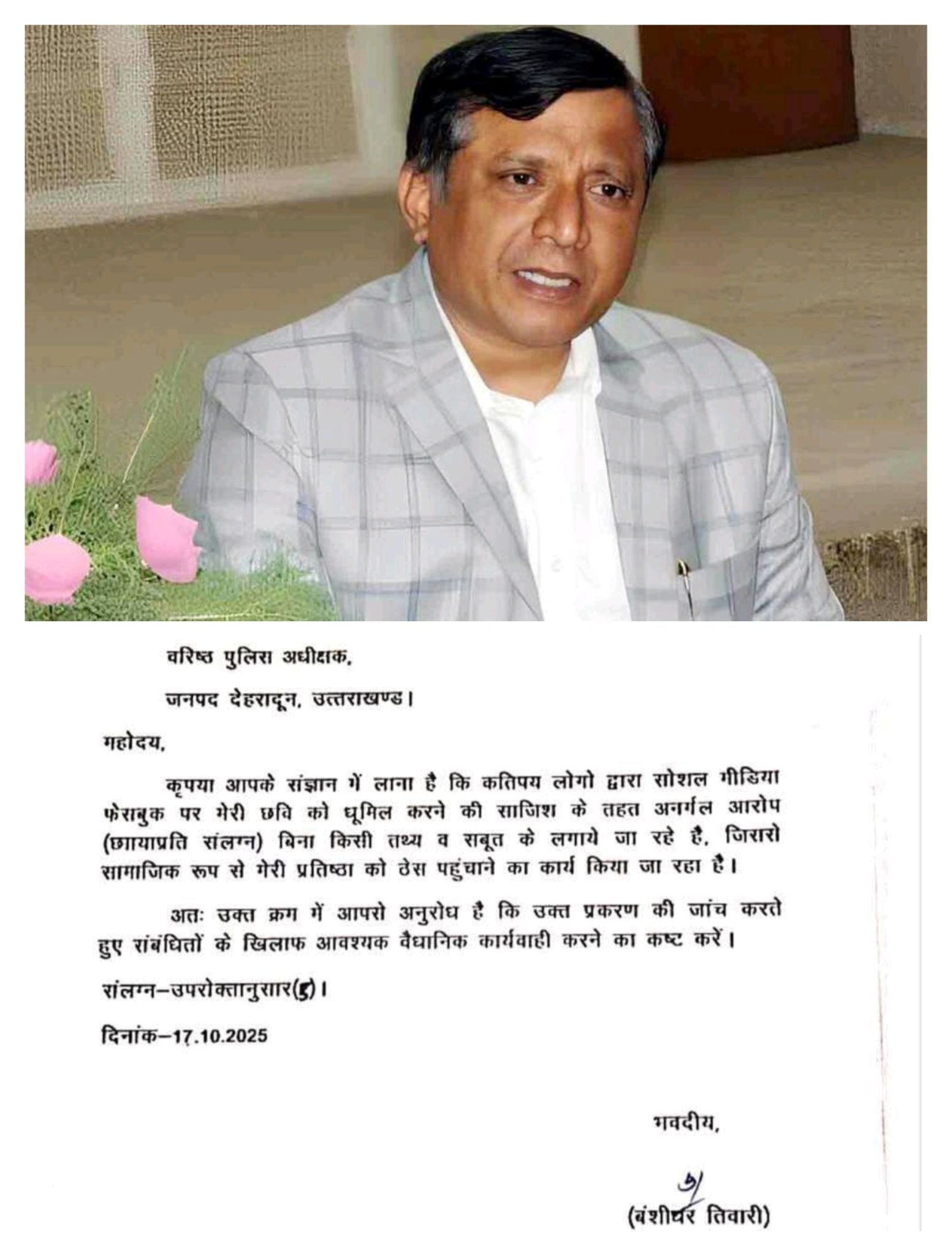 उत्तराखंड के महानिदेशक सूचना एवं लोक जनसंपर्क, बंशीधर तिवारी की छवि को जानबूझकर धूमिल करने की हो रही कथित कोशिशों पर डीजी (DG) ने कड़ा रुख अपनाया है। महानिदेशक बंशीधर तिवारी ने आवश्यक कानूनी कार्रवाई के लिए SSP देहरादून को पत्र लिखा है।