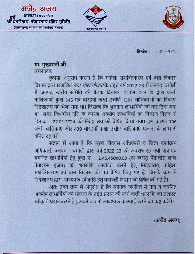 मुख्यमंत्री धामी से भेंट के दौरान बीकेटीसी के पूर्व अध्यक्ष अजेंद्र ने महिला सशक्तिकरण एवं बाल विकास विभाग द्वारा संचालित नंदा-गौरा योजना के तहत चमोली जिले में छूटे लाभार्थियों के लिए बजट स्वीकृति का मामला भी उठाया। उन्होंने कहा की चमोली जिले में नंदा-गौरा योजना के तहत वर्ष 2022- 23 में जन्मी 345 बालिकाओं और बारहवीं कक्षा उत्तीर्ण करने वाली 1391 बालिकाओं को योजना का लाभ मिल गया। मगर विभागीय त्रुटि के कारण 196 जन्मी बालिकाएं और 439 बारहवीं कक्षा उत्तीर्ण बालिकाएं योजना के लाभ से वंचित रह गईं। उन्होंने कहा कि योजना के तहत वंचित रह गयी पात्र बालिकाओं हेतु अवशेष भुगतान की पत्रावली बाल विकास निदेशालय द्वारा शासन को प्रेषित की गयी है। उन्होंने मुख्यमंत्री से तत्काल बजट स्वीकृति का अनुरोध किया।