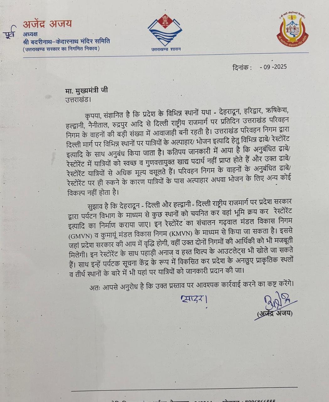 मुख्यमंत्री आवास पर भेंट के दौरान अजेंद्र ने इस संबंध में मुख्यमंत्री धामी को एक पत्र भी सौंपा। पत्र में कहा गया है कि प्रदेश के विभिन्न स्थानों यथा – देहरादून, हरिद्वार, ऋषिकेश, हल्द्वानी, नैनीताल, रुद्रपुर आदि स्थानों से दिल्ली राष्ट्रीय राजमार्ग पर प्रतिदिन उत्तराखंड परिवहन निगम के वाहनों की बड़ी संख्या में आवाजाही बनी रहती है। परिवहन निगम द्वारा दिल्ली मार्ग पर विभिन्न स्थानों पर यात्रियों के अल्पाहार व भोजन इत्यादि हेतु ढाबे व रेस्टोरेंट इत्यादि के साथ अनुबंध किया जाता है। कतिपय बार इन ढाबों व रेस्टोरेंट के बारे में यात्रियों द्वारा स्वच्छ व गुणवत्तायुक्त खाद्य पदार्थ नहीं उपलब्ध कराने की शिकायतें भी प्राप्त होती हैं।
