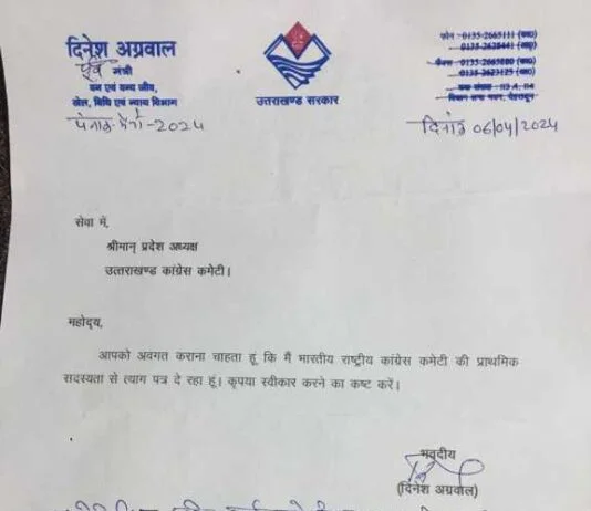 उत्तराखंड कांग्रेस से आज की बड़ी खबर पूर्व कैबिनेट मंत्री दिनेश अग्रवाल ने कांग्रेस का दामन छोड़ा पार्टी से दें दिया इस्तीफा दिनेश अग्रवाल ने अपने लेटर पेड पर कांग्रेस अध्यक्ष को पत्र लिखते हुए  कहा कि वह अपनी प्राथमिक सदस्यता से इस्तीफा दे रहे हैं उसको स्वीकार करने का कष्ट करें
